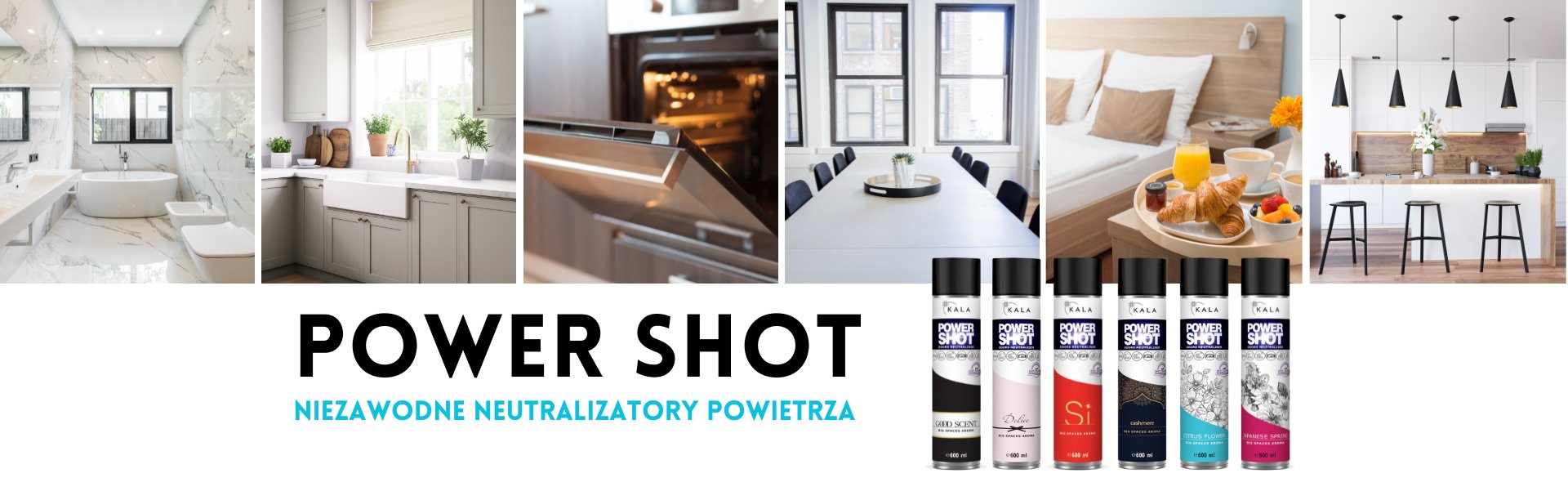 Zestaw profesjonalnych odświeżaczy Kala Power Shot 600 ml – 6 intensywnych zapachów, które skutecznie neutralizują nieprzyjemne wonie i odświeżają duże przestrzenie jednym naciśnięciem.