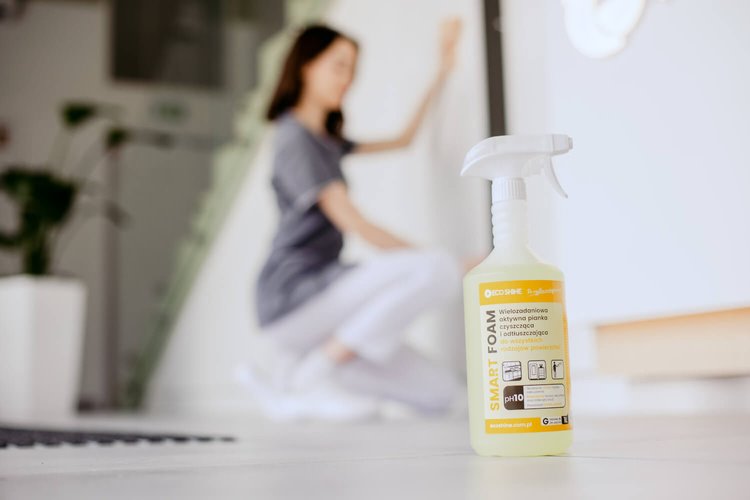 Po czyszczeniu szyb lub bardzo gładkich powierzchni spłukać wodą. Zaleca się sprawdzić, czy lepszy efekt daje pianka, czy mgiełka.