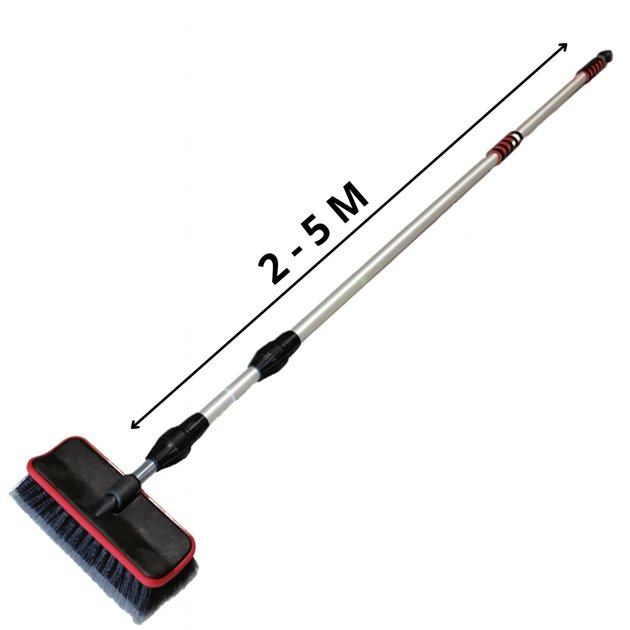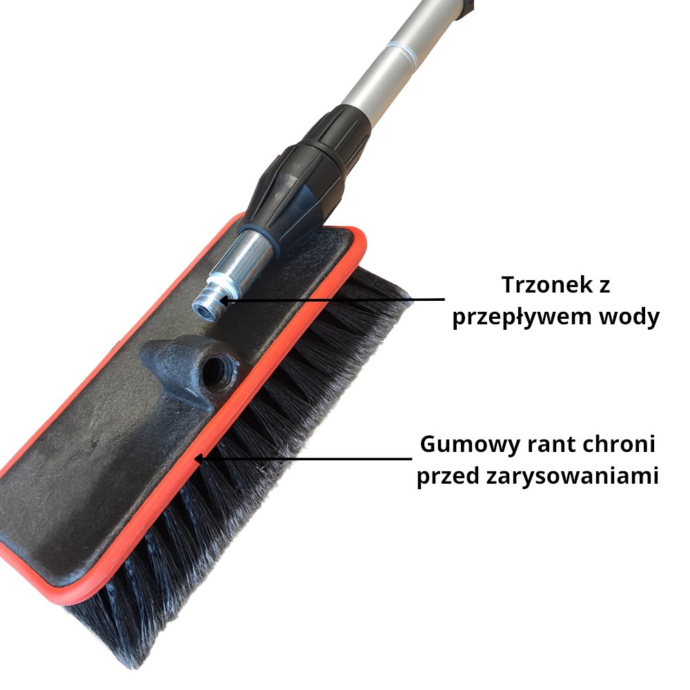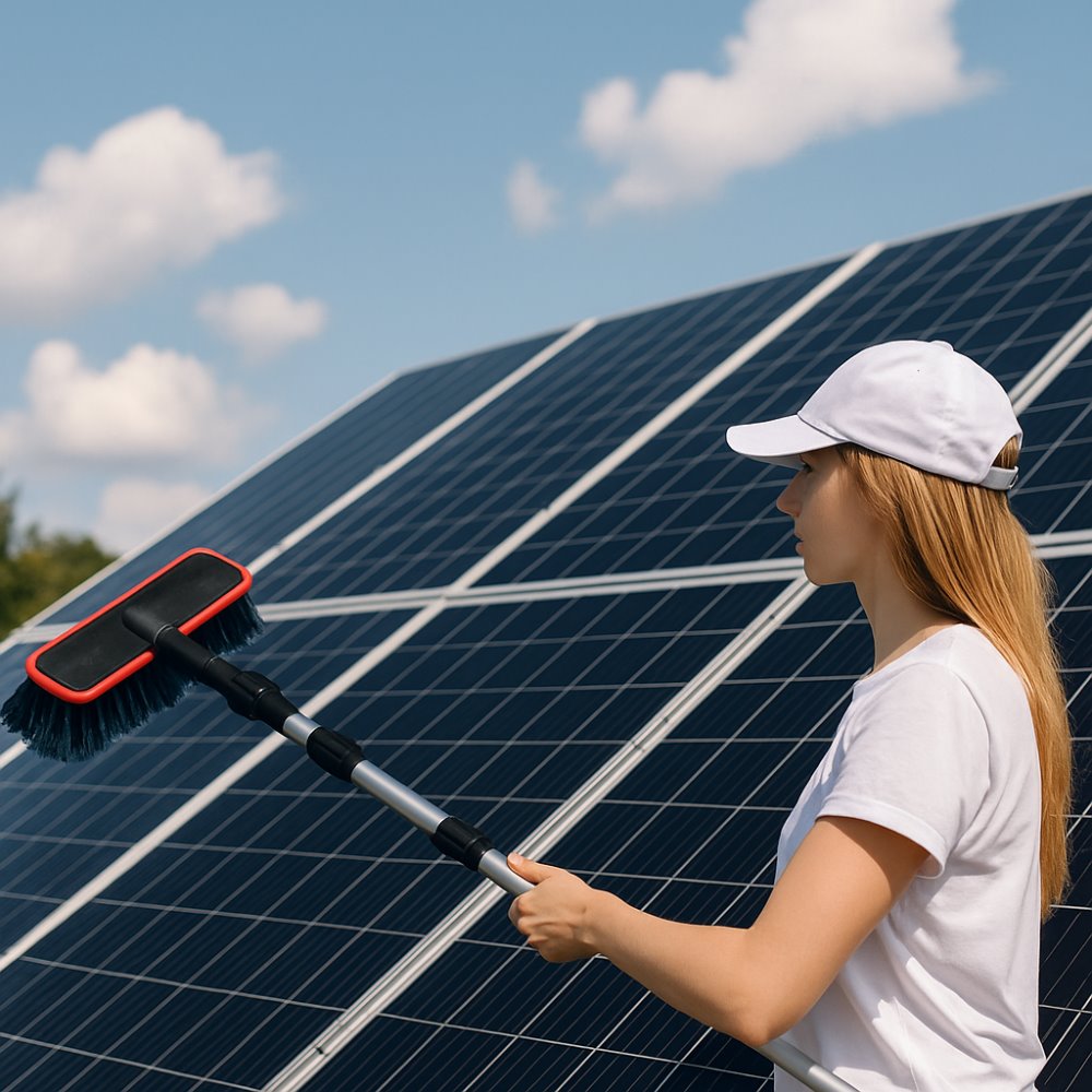 Profesjonalna szczotka teleskopowa do bezpiecznego mycia i odśnieżania paneli fotowoltaicznych, kolektorów słonecznych oraz solarów. Wykonana z lekkiego aluminium, posiada regulowany kij o długości 2–5 m, który umożliwia wygodne dotarcie do trudno dostępnych miejsc. Dzięki miękkiemu włosiu i wbudowanemu przepływowi wody skutecznie czyści bez ryzyka zarysowań.